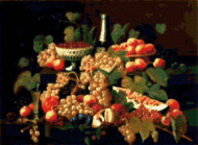 Ориентировочно так, схема вышивки «Unnamed-1215107», созданная автором malkinaiv, будет выглядеть при отшиве на канве. Размер данной вышивки равен 190x139 крестов, при этом используется 53 цветов. Ключевые слова, по которым можно найти эту схему: искусство, живопись, картина, натюрморт, фрукты. Также, вы можете взглянуть на оригинальную картинку, соответствующую данной схеме вышивки.