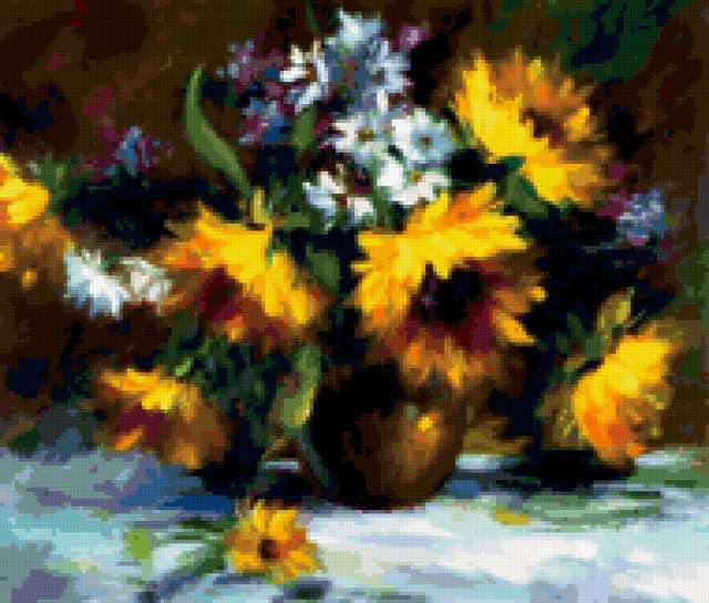 Ориентировочно так, схема вышивки «Unnamed-200769», созданная автором belal14, будет выглядеть при отшиве на канве. Размер данной вышивки равен 190x162 крестов, при этом используется 78 цветов. Ключевые слова, по которым можно найти эту схему: цветы, подсолнухи, натюрморт. Также, вы можете взглянуть на оригинальную картинку, соответствующую данной схеме вышивки.