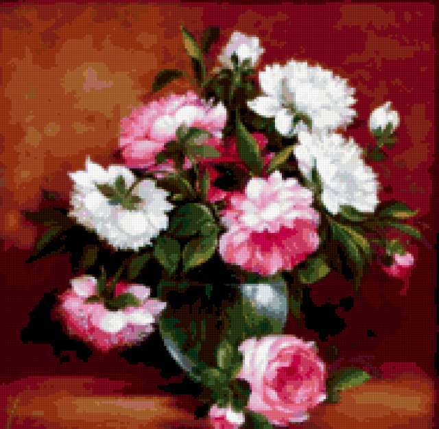 Ориентировочно так, схема вышивки «Unnamed-211994», созданная автором mgalimosca, будет выглядеть при отшиве на канве. Размер данной вышивки равен 190x186 крестов, при этом используется 68 цветов. Ключевые слова, по которым можно найти эту схему: пионы, цыеты, букет, ваза, натюрморт. Также, вы можете взглянуть на оригинальную картинку, соответствующую данной схеме вышивки.