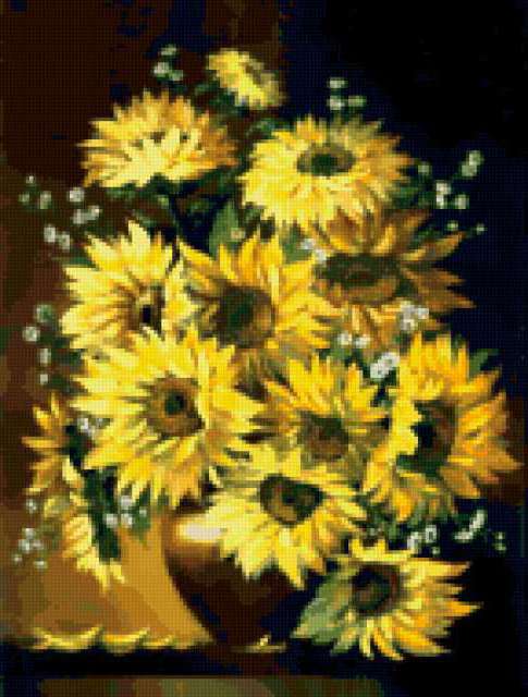 Ориентировочно так, схема вышивки «Unnamed-223868», созданная автором belal14, будет выглядеть при отшиве на канве. Размер данной вышивки равен 144x190 крестов, при этом используется 63 цветов. Ключевые слова, по которым можно найти эту схему: цветы, подсолнухи, натюрморт. Также, вы можете взглянуть на оригинальную картинку, соответствующую данной схеме вышивки.