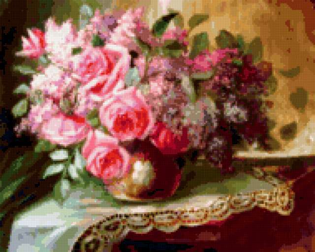 Ориентировочно так, схема вышивки «Unnamed-248577», созданная автором iborissova, будет выглядеть при отшиве на канве. Размер данной вышивки равен 190x152 крестов, при этом используется 86 цветов. Ключевые слова, по которым можно найти эту схему: розы, ваза. Также, вы можете взглянуть на оригинальную картинку, соответствующую данной схеме вышивки.