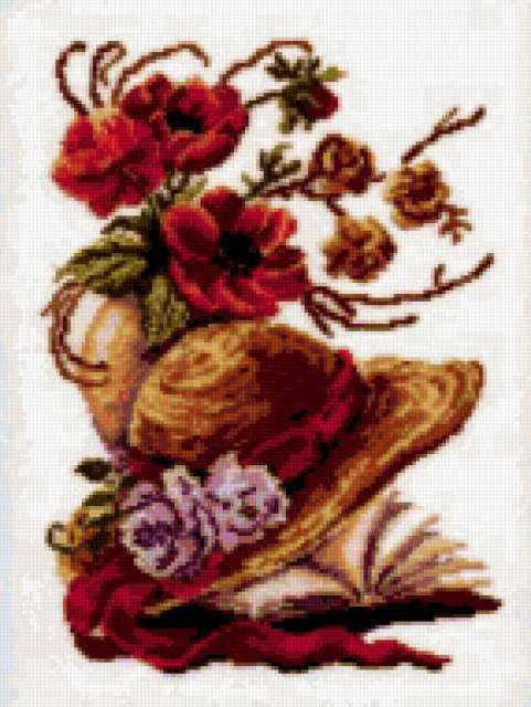 Ориентировочно так, схема вышивки «Unnamed-248618», созданная автором Svetlisha, будет выглядеть при отшиве на канве. Размер данной вышивки равен 143x190 крестов, при этом используется 67 цветов. Ключевые слова, по которым можно найти эту схему: цветы, шляпа, маки. Также, вы можете взглянуть на оригинальную картинку, соответствующую данной схеме вышивки.
