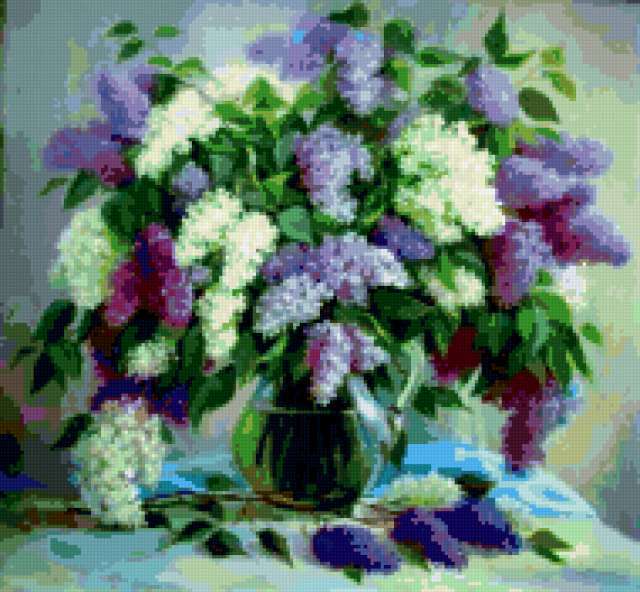 Ориентировочно так, схема вышивки «Unnamed-256059», созданная автором ayse, будет выглядеть при отшиве на канве. Размер данной вышивки равен 190x176 крестов, при этом используется 80 цветов. Ключевые слова, по которым можно найти эту схему: sireni, buket, vaza. Также, вы можете взглянуть на оригинальную картинку, соответствующую данной схеме вышивки.