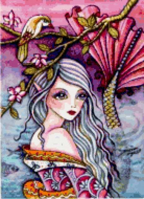 Ориентировочно так, схема вышивки «Unnamed-289872», созданная автором belal14, будет выглядеть при отшиве на канве. Размер данной вышивки равен 138x190 крестов, при этом используется 88 цветов. Ключевые слова, по которым можно найти эту схему: девушка, русалка, картина, портрет, море. Также, вы можете взглянуть на оригинальную картинку, соответствующую данной схеме вышивки.