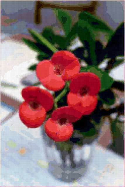 Ориентировочно так, схема вышивки «Unnamed-290772», созданная автором malkinaiv, будет выглядеть при отшиве на канве. Размер данной вышивки равен 127x190 крестов, при этом используется 76 цветов. Ключевые слова, по которым можно найти эту схему: цветы, букет, вазы. Также, вы можете взглянуть на оригинальную картинку, соответствующую данной схеме вышивки.