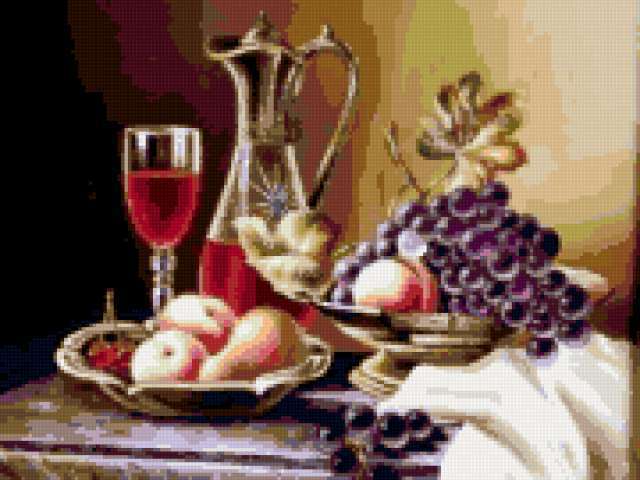 Ориентировочно так, схема вышивки «Unnamed-349990», созданная автором Lamisa, будет выглядеть при отшиве на канве. Размер данной вышивки равен 180x135 крестов, при этом используется 49 цветов. Ключевые слова, по которым можно найти эту схему: натюрморт, фрукты. Также, вы можете взглянуть на оригинальную картинку, соответствующую данной схеме вышивки.