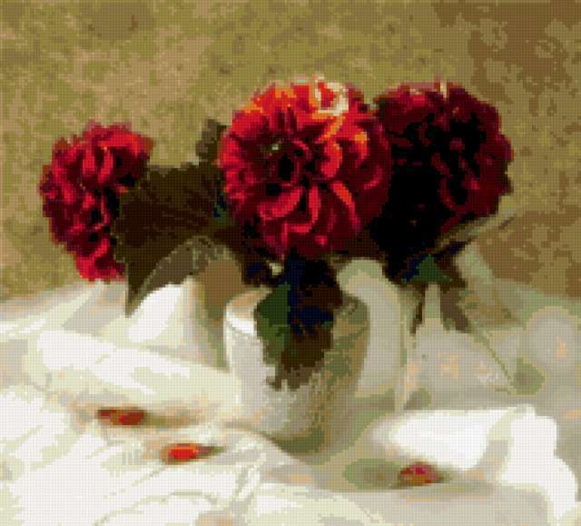 Ориентировочно так, схема вышивки «Unnamed-354722», созданная автором ayse, будет выглядеть при отшиве на канве. Размер данной вышивки равен 190x172 крестов, при этом используется 43 цветов. Ключевые слова, по которым можно найти эту схему: vaza, buket, svetq. Также, вы можете взглянуть на оригинальную картинку, соответствующую данной схеме вышивки.