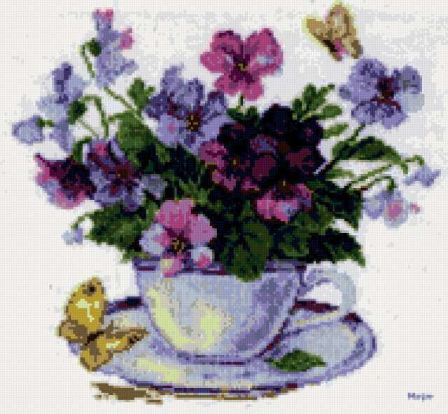 Ориентировочно так, схема вышивки «Unnamed-474910», созданная автором ayse, будет выглядеть при отшиве на канве. Размер данной вышивки равен 190x176 крестов, при этом используется 40 цветов. Ключевые слова, по которым можно найти эту схему: fialki, svetq, buket. Также, вы можете взглянуть на оригинальную картинку, соответствующую данной схеме вышивки.