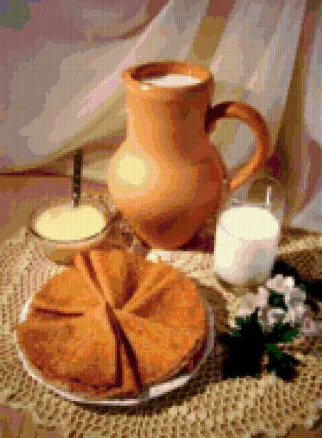 Ориентировочно так, схема вышивки «Unnamed-501067», созданная автором burova, будет выглядеть при отшиве на канве. Размер данной вышивки равен 140x190 крестов, при этом используется 73 цветов. Ключевые слова, по которым можно найти эту схему: натюрморт, кувшин, молоко, еда. Также, вы можете взглянуть на оригинальную картинку, соответствующую данной схеме вышивки.