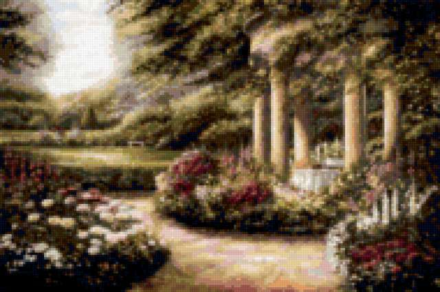 Ориентировочно так, схема вышивки «Unnamed-518499», созданная автором Aliko, будет выглядеть при отшиве на канве. Размер данной вышивки равен 190x126 крестов, при этом используется 72 цветов. Ключевые слова, по которым можно найти эту схему: парк, сад. Также, вы можете взглянуть на оригинальную картинку, соответствующую данной схеме вышивки.