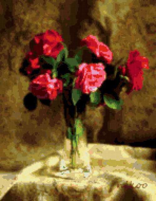 Ориентировочно так, схема вышивки «Unnamed-528638», созданная автором malkinaiv, будет выглядеть при отшиве на канве. Размер данной вышивки равен 148x190 крестов, при этом используется 47 цветов. Ключевые слова, по которым можно найти эту схему: цветы, букет, розы, вазы. Также, вы можете взглянуть на оригинальную картинку, соответствующую данной схеме вышивки.