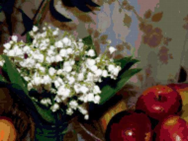 Ориентировочно так, схема вышивки «Unnamed-528695», созданная автором malkinaiv, будет выглядеть при отшиве на канве. Размер данной вышивки равен 190x143 крестов, при этом используется 74 цветов. Ключевые слова, по которым можно найти эту схему: натюрморт, цветы, букет, ландыши, яблоки, фрукты. Также, вы можете взглянуть на оригинальную картинку, соответствующую данной схеме вышивки.