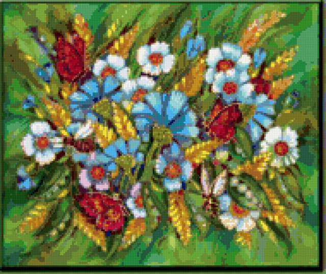 Ориентировочно так, схема вышивки «Unnamed-532253», созданная автором burova, будет выглядеть при отшиве на канве. Размер данной вышивки равен 190x160 крестов, при этом используется 68 цветов. Ключевые слова, по которым можно найти эту схему: цветы, букет, васильки, ромашки. Также, вы можете взглянуть на оригинальную картинку, соответствующую данной схеме вышивки.