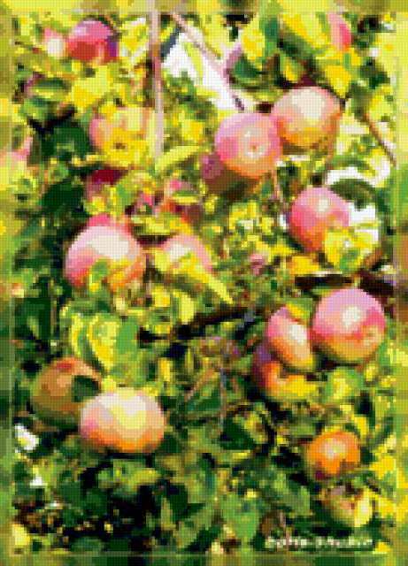 Ориентировочно так, схема вышивки «Unnamed-550478», созданная автором malkinaiv, будет выглядеть при отшиве на канве. Размер данной вышивки равен 137x190 крестов, при этом используется 76 цветов. Ключевые слова, по которым можно найти эту схему: яблоки, фрукты, сад. Также, вы можете взглянуть на оригинальную картинку, соответствующую данной схеме вышивки.