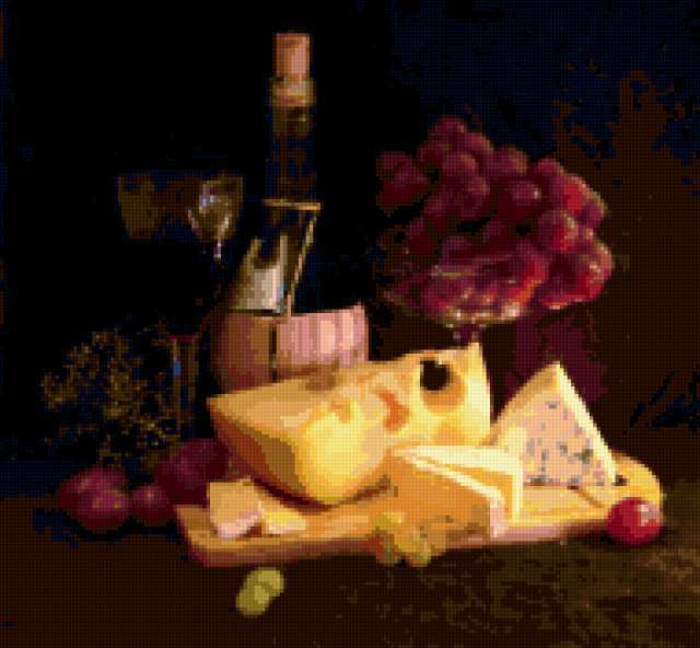 Ориентировочно так, схема вышивки «Unnamed-550482», созданная автором malkinaiv, будет выглядеть при отшиве на канве. Размер данной вышивки равен 190x176 крестов, при этом используется 63 цветов. Ключевые слова, по которым можно найти эту схему: натюрморт, вино, сыр, виноград. Также, вы можете взглянуть на оригинальную картинку, соответствующую данной схеме вышивки.