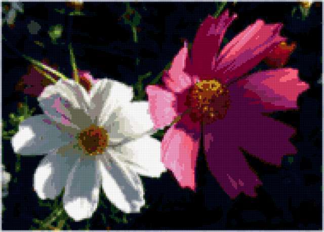 Ориентировочно так, схема вышивки «Unnamed-550559», созданная автором malkinaiv, будет выглядеть при отшиве на канве. Размер данной вышивки равен 190x136 крестов, при этом используется 55 цветов. Ключевые слова, по которым можно найти эту схему: цветы, космеи. Также, вы можете взглянуть на оригинальную картинку, соответствующую данной схеме вышивки.