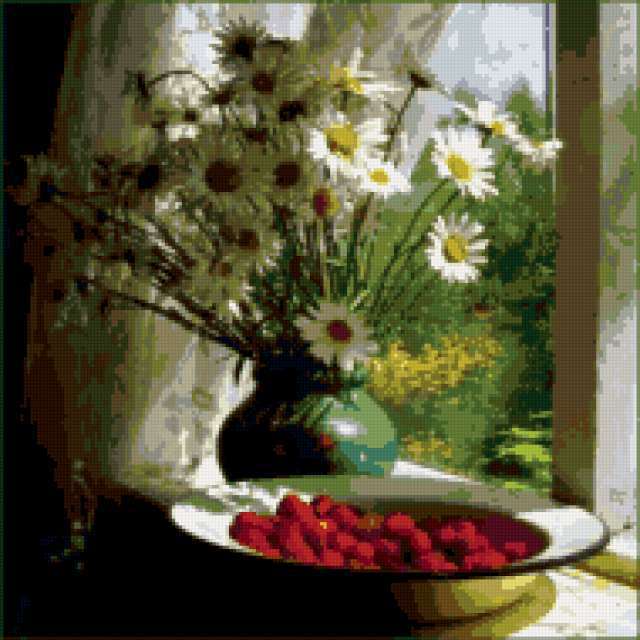 Ориентировочно так, схема вышивки «Unnamed-572590», созданная автором malkinaiv, будет выглядеть при отшиве на канве. Размер данной вышивки равен 190x190 крестов, при этом используется 55 цветов. Ключевые слова, по которым можно найти эту схему: натюрморт, цветы, ягоды, букет, окно. Также, вы можете взглянуть на оригинальную картинку, соответствующую данной схеме вышивки.