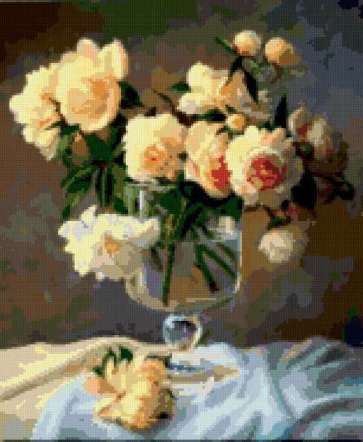 Ориентировочно так, схема вышивки «Unnamed-586904», созданная автором ayse, будет выглядеть при отшиве на канве. Размер данной вышивки равен 156x190 крестов, при этом используется 47 цветов. Ключевые слова, по которым можно найти эту схему: buket, svetq, vaza. Также, вы можете взглянуть на оригинальную картинку, соответствующую данной схеме вышивки.