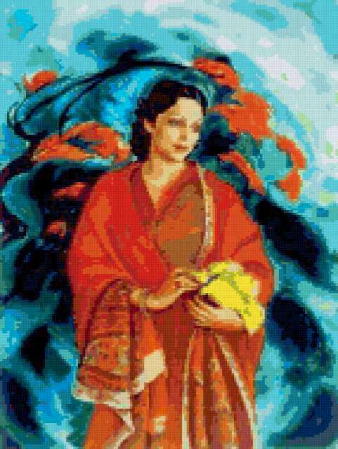Ориентировочно так, схема вышивки «Unnamed-589225», созданная автором aleveg, будет выглядеть при отшиве на канве. Размер данной вышивки равен 143x190 крестов, при этом используется 56 цветов. Ключевые слова, по которым можно найти эту схему: восточная красота, женский образ.. Также, вы можете взглянуть на оригинальную картинку, соответствующую данной схеме вышивки.