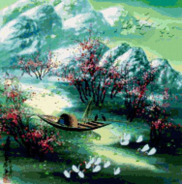 Ориентировочно так, схема вышивки «Unnamed-594633», созданная автором Aliko, будет выглядеть при отшиве на канве. Размер данной вышивки равен 188x190 крестов, при этом используется 73 цветов. Ключевые слова, по которым можно найти эту схему: весна, пейзаж. Также, вы можете взглянуть на оригинальную картинку, соответствующую данной схеме вышивки.