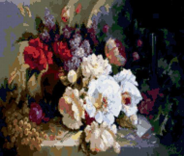Ориентировочно так, схема вышивки «Unnamed-596105», созданная автором ayse, будет выглядеть при отшиве на канве. Размер данной вышивки равен 190x162 крестов, при этом используется 42 цветов. Ключевые слова, по которым можно найти эту схему: buket, svetq, vaza, roses. Также, вы можете взглянуть на оригинальную картинку, соответствующую данной схеме вышивки.