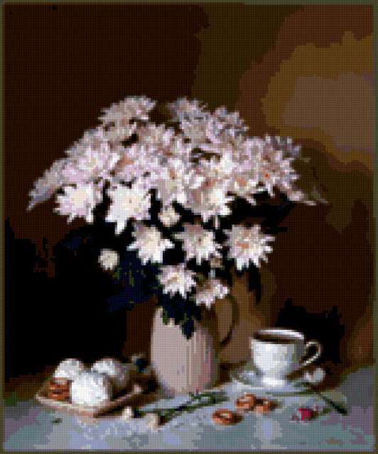 Ориентировочно так, схема вышивки «Unnamed-599135», созданная автором ayse, будет выглядеть при отшиве на канве. Размер данной вышивки равен 158x190 крестов, при этом используется 39 цветов. Ключевые слова, по которым можно найти эту схему: buket, svetq, vaza. Также, вы можете взглянуть на оригинальную картинку, соответствующую данной схеме вышивки.