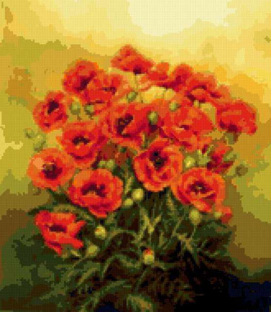 Ориентировочно так, схема вышивки «Unnamed-601366», созданная автором Minin, будет выглядеть при отшиве на канве. Размер данной вышивки равен 165x190 крестов, при этом используется 41 цветов. Ключевые слова, по которым можно найти эту схему: живопись, искусство, картина, природа, цветы, маки. Также, вы можете взглянуть на оригинальную картинку, соответствующую данной схеме вышивки.