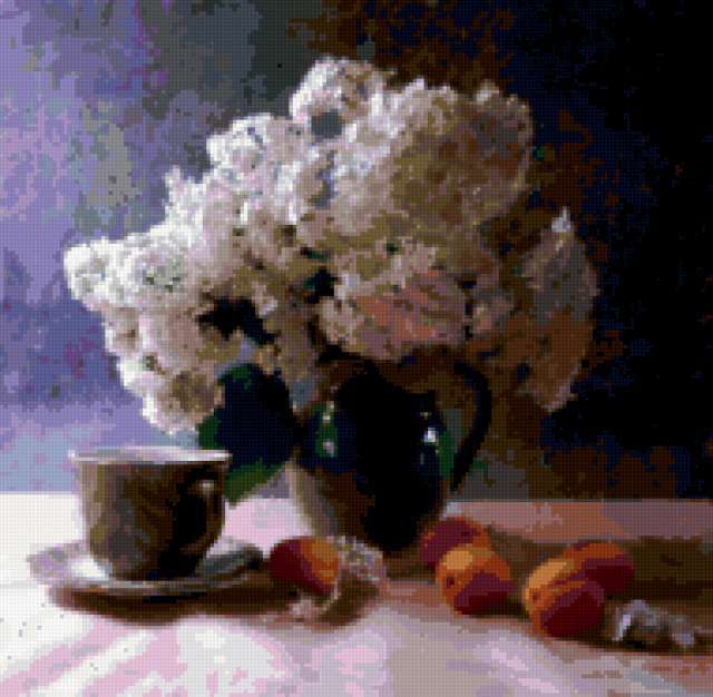 Ориентировочно так, схема вышивки «Unnamed-602146», созданная автором malkinaiv, будет выглядеть при отшиве на канве. Размер данной вышивки равен 190x186 крестов, при этом используется 65 цветов. Ключевые слова, по которым можно найти эту схему: натюрморт, цветы, букет, фрукты, чашка. Также, вы можете взглянуть на оригинальную картинку, соответствующую данной схеме вышивки.
