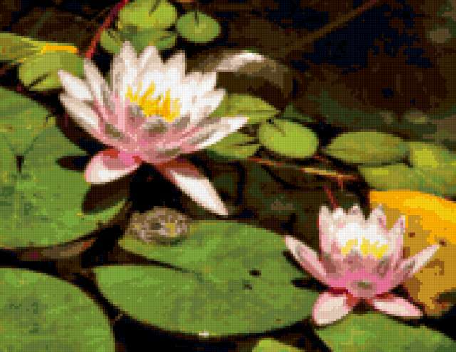 Ориентировочно так, схема вышивки «Unnamed-602978», созданная автором malkinaiv, будет выглядеть при отшиве на канве. Размер данной вышивки равен 190x147 крестов, при этом используется 48 цветов. Ключевые слова, по которым можно найти эту схему: цветы, лилии, озеро, лягушка. Также, вы можете взглянуть на оригинальную картинку, соответствующую данной схеме вышивки.