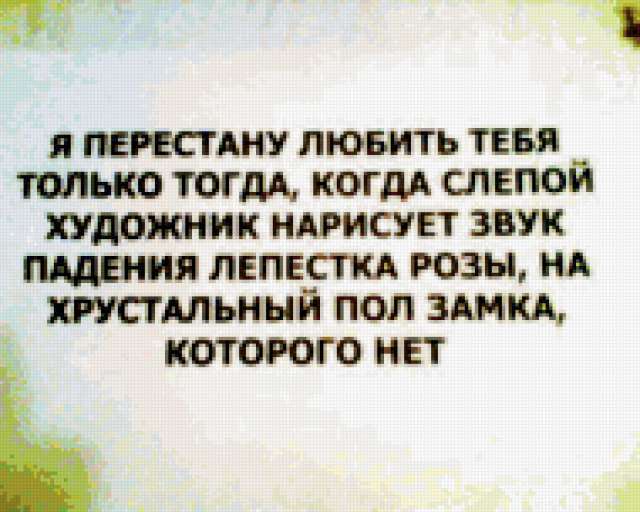 Ориентировочно так, схема вышивки «Unnamed-616548», созданная автором salnikova1985, будет выглядеть при отшиве на канве. Размер данной вышивки равен 190x152 крестов, при этом используется 63 цветов. Ключевые слова, по которым можно найти эту схему: романтические надписи. Также, вы можете взглянуть на оригинальную картинку, соответствующую данной схеме вышивки.