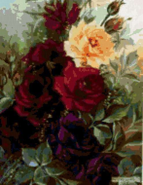 Ориентировочно так, схема вышивки «Unnamed-619440», созданная автором ayse, будет выглядеть при отшиве на канве. Размер данной вышивки равен 147x190 крестов, при этом используется 42 цветов. Ключевые слова, по которым можно найти эту схему: buket, svetq, vaza, roses. Также, вы можете взглянуть на оригинальную картинку, соответствующую данной схеме вышивки.