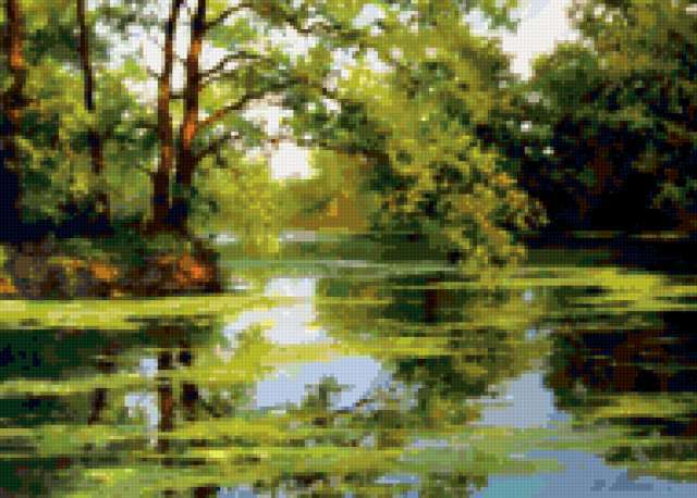 Ориентировочно так, схема вышивки «Unnamed-619736», созданная автором MarfaL, будет выглядеть при отшиве на канве. Размер данной вышивки равен 190x136 крестов, при этом используется 71 цветов. Ключевые слова, по которым можно найти эту схему: пейзаж, лето, река. Также, вы можете взглянуть на оригинальную картинку, соответствующую данной схеме вышивки.