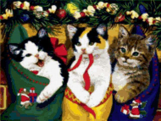 Ориентировочно так, схема вышивки «Unnamed-641230», созданная автором ostrovok_a, будет выглядеть при отшиве на канве. Размер данной вышивки равен 190x143 крестов, при этом используется 81 цветов. Ключевые слова, по которым можно найти эту схему: коты, новый, год. Также, вы можете взглянуть на оригинальную картинку, соответствующую данной схеме вышивки.
