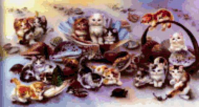 Ориентировочно так, схема вышивки «Unnamed-642362», созданная автором malkinaiv, будет выглядеть при отшиве на канве. Размер данной вышивки равен 190x102 крестов, при этом используется 78 цветов. Ключевые слова, по которым можно найти эту схему: котята, кошки, животные. Также, вы можете взглянуть на оригинальную картинку, соответствующую данной схеме вышивки.