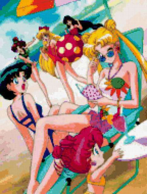Ориентировочно так, схема вышивки «Unnamed-653863», созданная автором AuraDomo, будет выглядеть при отшиве на канве. Размер данной вышивки равен 144x190 крестов, при этом используется 79 цветов. Ключевые слова, по которым можно найти эту схему: сейлор мун, усаги цукино, аниме, ами мизуно, рей хино, минако аино, чиби-чиби. Также, вы можете взглянуть на оригинальную картинку, соответствующую данной схеме вышивки.