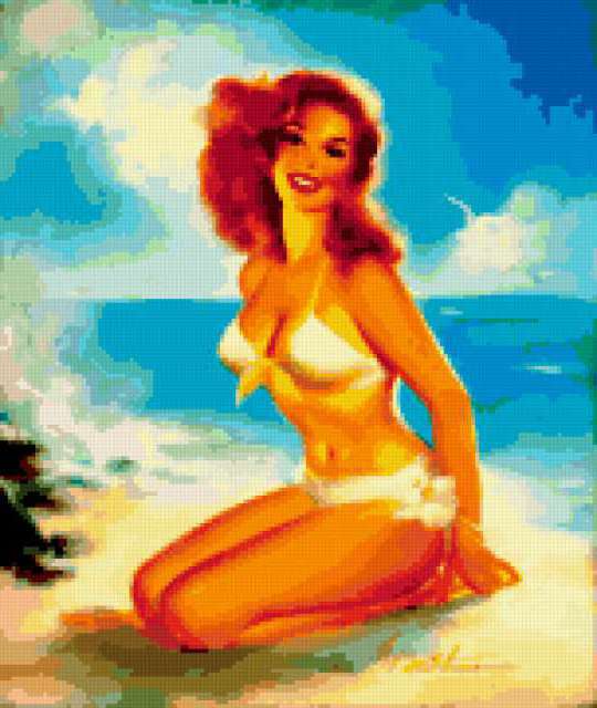 Ориентировочно так, схема вышивки «Unnamed-656987», созданная автором irada68, будет выглядеть при отшиве на канве. Размер данной вышивки равен 152x180 крестов, при этом используется 58 цветов. Ключевые слова, по которым можно найти эту схему: ретро, девушка, пляж, море. Также, вы можете взглянуть на оригинальную картинку, соответствующую данной схеме вышивки.