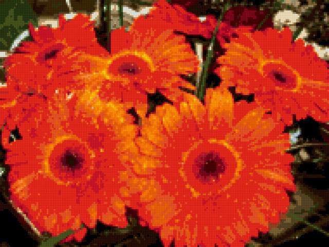 Ориентировочно так, схема вышивки «Unnamed-662511», созданная автором malkinaiv, будет выглядеть при отшиве на канве. Размер данной вышивки равен 190x143 крестов, при этом используется 41 цветов. Ключевые слова, по которым можно найти эту схему: цветы, герберы. Также, вы можете взглянуть на оригинальную картинку, соответствующую данной схеме вышивки.