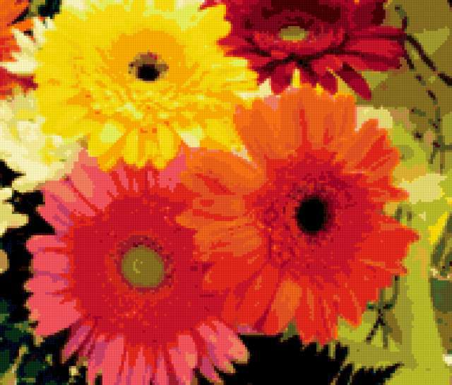 Ориентировочно так, схема вышивки «Unnamed-673692», созданная автором malkinaiv, будет выглядеть при отшиве на канве. Размер данной вышивки равен 190x162 крестов, при этом используется 40 цветов. Ключевые слова, по которым можно найти эту схему: цветы, букет, герберы. Также, вы можете взглянуть на оригинальную картинку, соответствующую данной схеме вышивки.