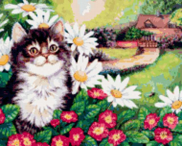 Ориентировочно так, схема вышивки «Unnamed-673717», созданная автором malkinaiv, будет выглядеть при отшиве на канве. Размер данной вышивки равен 190x152 крестов, при этом используется 64 цветов. Ключевые слова, по которым можно найти эту схему: котенок, котята, кошки, животные, цветы, пейзаж. Также, вы можете взглянуть на оригинальную картинку, соответствующую данной схеме вышивки.