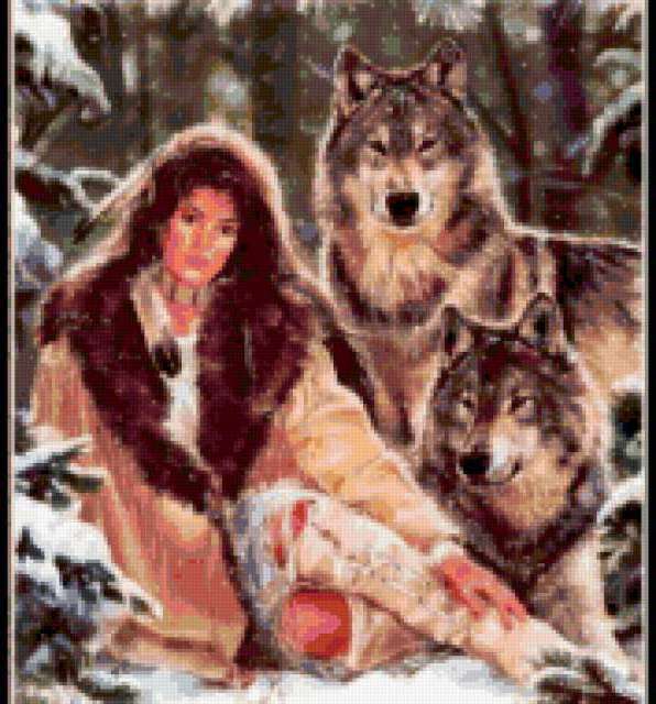 Ориентировочно так, схема вышивки «Unnamed-676175», созданная автором Len_a, будет выглядеть при отшиве на канве. Размер данной вышивки равен 177x190 крестов, при этом используется 75 цветов. Ключевые слова, по которым можно найти эту схему: девушка, волки, лес, природа, дружба. Также, вы можете взглянуть на оригинальную картинку, соответствующую данной схеме вышивки.