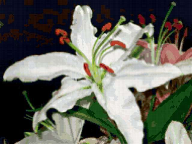 Ориентировочно так, схема вышивки «Unnamed-703792», созданная автором malkinaiv, будет выглядеть при отшиве на канве. Размер данной вышивки равен 190x143 крестов, при этом используется 47 цветов. Ключевые слова, по которым можно найти эту схему: цветы, лилии. Также, вы можете взглянуть на оригинальную картинку, соответствующую данной схеме вышивки.