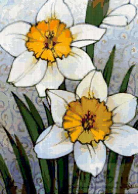 Ориентировочно так, схема вышивки «Unnamed-705771», созданная автором malkinaiv, будет выглядеть при отшиве на канве. Размер данной вышивки равен 135x190 крестов, при этом используется 48 цветов. Ключевые слова, по которым можно найти эту схему: цветы, нарциссы. Также, вы можете взглянуть на оригинальную картинку, соответствующую данной схеме вышивки.