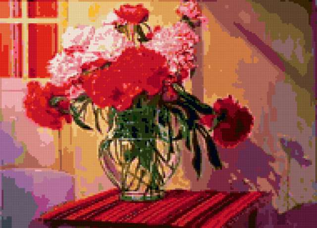 Ориентировочно так, схема вышивки «Unnamed-721877», созданная автором ayse, будет выглядеть при отшиве на канве. Размер данной вышивки равен 190x137 крестов, при этом используется 45 цветов. Ключевые слова, по которым можно найти эту схему: buket, svetq, vaza. Также, вы можете взглянуть на оригинальную картинку, соответствующую данной схеме вышивки.