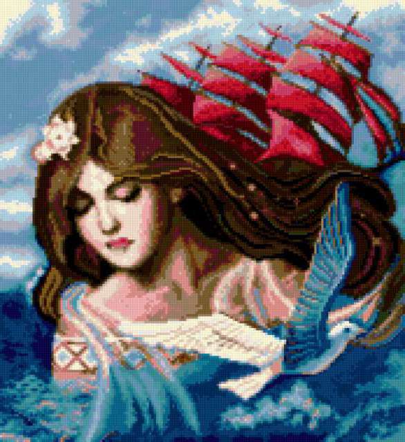 Ориентировочно так, схема вышивки «Unnamed-731928», созданная автором margoritag, будет выглядеть при отшиве на канве. Размер данной вышивки равен 174x190 крестов, при этом используется 51 цветов. Ключевые слова, по которым можно найти эту схему: подушка, девушка, корабль, чайка, картинка, разное. Также, вы можете взглянуть на оригинальную картинку, соответствующую данной схеме вышивки.