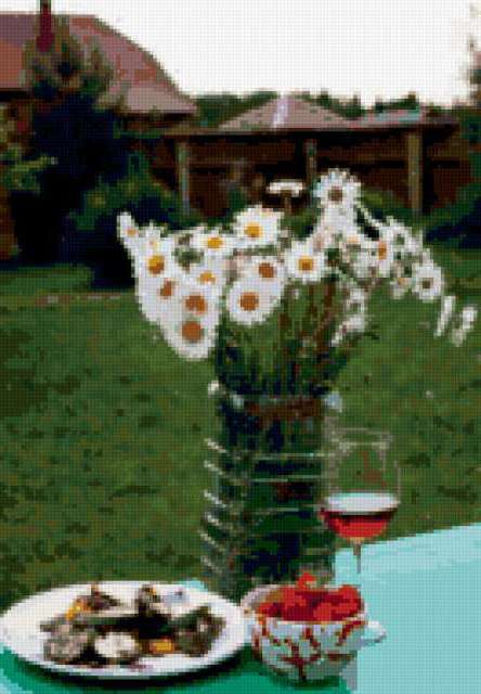 Ориентировочно так, схема вышивки «Unnamed-734950», созданная автором malkinaiv, будет выглядеть при отшиве на канве. Размер данной вышивки равен 132x190 крестов, при этом используется 59 цветов. Ключевые слова, по которым можно найти эту схему: натюрморт, пейзаж, цветы, букет, ромашки. Также, вы можете взглянуть на оригинальную картинку, соответствующую данной схеме вышивки.
