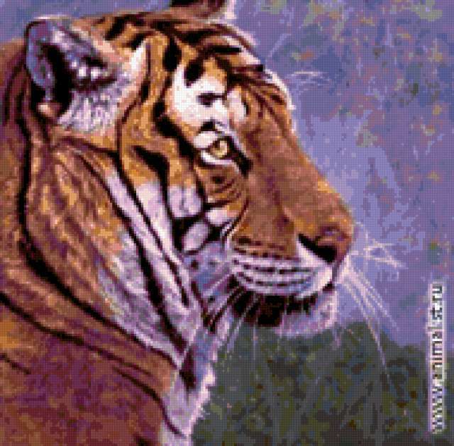 Ориентировочно так, схема вышивки «Unnamed-737985», созданная автором svetiknik, будет выглядеть при отшиве на канве. Размер данной вышивки равен 190x187 крестов, при этом используется 67 цветов. Ключевые слова, по которым можно найти эту схему: тигр, животные, звери. Также, вы можете взглянуть на оригинальную картинку, соответствующую данной схеме вышивки.