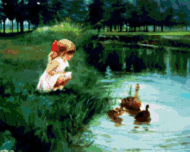 Ориентировочно так, схема вышивки «Unnamed-741343», созданная автором savva_25, будет выглядеть при отшиве на канве. Размер данной вышивки равен 190x152 крестов, при этом используется 58 цветов. Ключевые слова, по которым можно найти эту схему: девочка, озеро, утки, трава, лето. Также, вы можете взглянуть на оригинальную картинку, соответствующую данной схеме вышивки.
