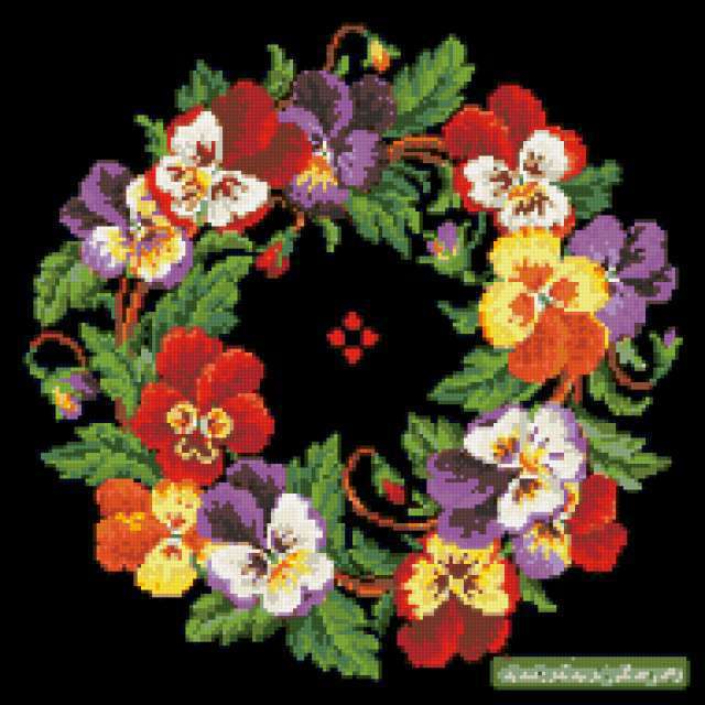 Ориентировочно так, схема вышивки «Unnamed-748831», созданная автором ayse, будет выглядеть при отшиве на канве. Размер данной вышивки равен 190x190 крестов, при этом используется 43 цветов. Ключевые слова, по которым можно найти эту схему: buket, svetq, fialki. Также, вы можете взглянуть на оригинальную картинку, соответствующую данной схеме вышивки.