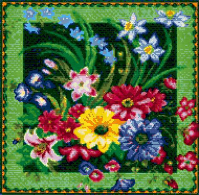 Ориентировочно так, схема вышивки «Unnamed-768824», созданная автором anor, будет выглядеть при отшиве на канве. Размер данной вышивки равен 190x187 крестов, при этом используется 38 цветов. Ключевые слова, по которым можно найти эту схему: цветы, подушка, для интерьера, для офиса, картина. Также, вы можете взглянуть на оригинальную картинку, соответствующую данной схеме вышивки.