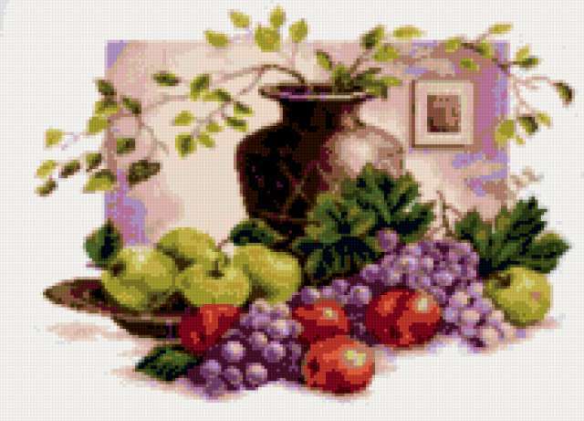Ориентировочно так, схема вышивки «Unnamed-769252», созданная автором anor, будет выглядеть при отшиве на канве. Размер данной вышивки равен 190x137 крестов, при этом используется 46 цветов. Ключевые слова, по которым можно найти эту схему: натюрморт, фрукты, для кухни, ваза, картина, ягоды. Также, вы можете взглянуть на оригинальную картинку, соответствующую данной схеме вышивки.